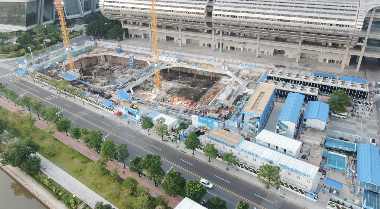 中建八局廣交會展館四期項目經(jīng)理許本盈介紹,由于指揮中心基坑北側(cè)無限接近規(guī)劃紅線、東側(cè)與酒店地下室共用地連墻等原因,導致基坑施工過程無法形成環(huán)路,且南側(cè)和西側(cè)場地寬度僅有7至8米,占地面積十分狹小。